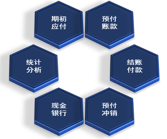 主要包括:应付账款管理、应付费用、预付款管理、对账管理、付款、坏账管理、账户收支总账、账户收支明细账,以及应付管理相关的明细报表和统计分析报表及图表。