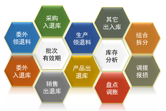 主要包括:采购入库、采购退货、产品入(退)库、库存调拨、生产领(退)料、委外领(退)料、委外入库、发外退货、其它入库、其它出库、料品组合(折分)、库存报损、库存查询、库存盘点、库存调账、库存月结等功能,提供多仓库分仓位管理提示控制、呆滞料分析等功能,以及库存管理相关的明细报表和统计分析报表及图表。
