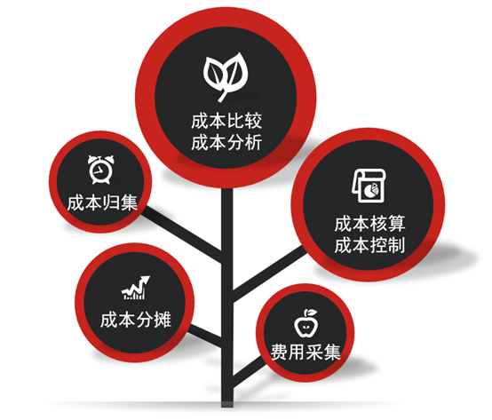 主要包括:折旧费用录入(从固定资产管理模块中转入)与分摊,辅助材料费用录入(从领料单中转入)与分摊,其它费用录入与分摊,薪资费用录入(从薪资管理模块中转入)与分摊,工单成本计算,订单成本计算,产品成本计算。并生成相应的成本报表。