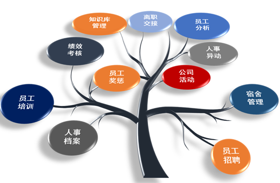 主要包括:人事档案管理、员工奖惩管理、员工宿舍管理、员工绩效考核、员工异动、员工培训管理、员工生日管理、员工离职管理,以及人力资源管理相关的明细报表和统计分析报表及图表。