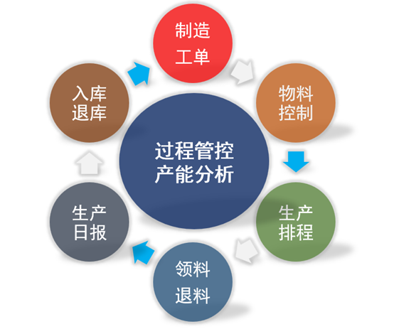 主要包括:生产计划管理、生产工单下达、生产物料清单生成及控制领发料、生产领(退)料、生产日报及生产转序、生产进度掌控、生产入库申请、生产入库检验、产品入(退)库,以及生产管理相关的明细报表和统计分析报表及图表。