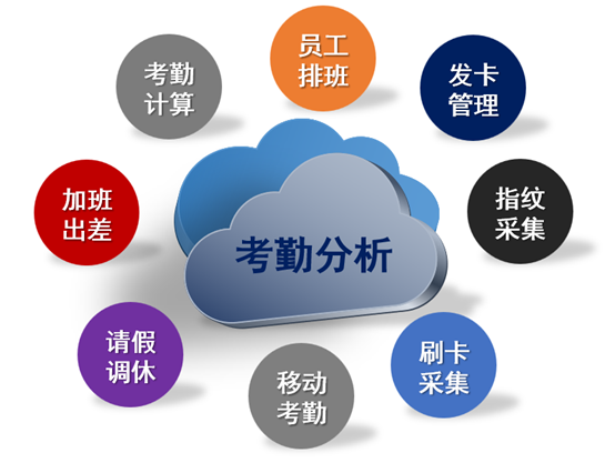 主要包括:员工卡片管理、班次设定、排班管理、刷卡数据管理、员工加班管理,员工请假管理、员工休假管理、员工出差管理、考勤日结、考勤月结以及考勤系统相关明细和汇总分析报表及图表。