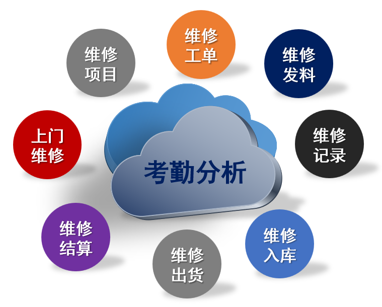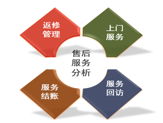 主要包括:客服服务,返修登记,返修检测,维修领退料,维修记录,维修出货,维修结账,发出维修,维修返回等功能,以及售后服务管理相关的明细报表和统计分析报表及图表。