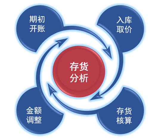 主要包括:存货期初开账,入库批量取价,存货核算,库存金额调整,存货月结,存货核算查询以及存货核算相关报表。