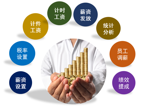 主要包括:薪资项目定义、个人所得税率定义、薪资期间定义、固定薪资录入、员工调薪、变动薪资录入、考勤数据录入、个人计件数据录入、集体计件数据录入、薪资计算、薪资表、薪资条等管理,以及薪资管理相关的明细报表和统计分析报表及图表。