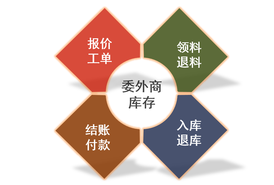 主要包括:委外报价、委外计划、委外计划结案、委外工单、委外工单结案、委外物料清单生成及控制领发料、委外发(退)料管理、委外暂收及委外入库(退货)、委外调价、委外费用、应付结账管理等功能,以及委外管理相关的明细报表和统计分析报表及图表。
